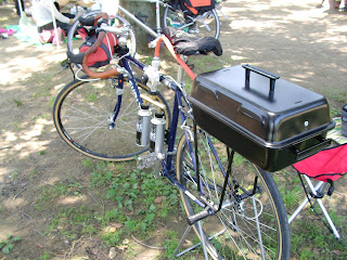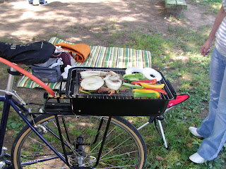 Here it is! At last, my strangest creation...the BBQ Bike! I installed a small propane gas BBQ grill onto my Surly bike rack. Took it out to the park for a test run. The results were: Delicious!